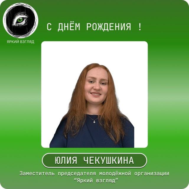 🤩В этот прекрасный день хотим поздравить нашего заместителя председателя молодёжной организации "Яркий взгляд" — Чекушкину Юлию Евгеньевну!